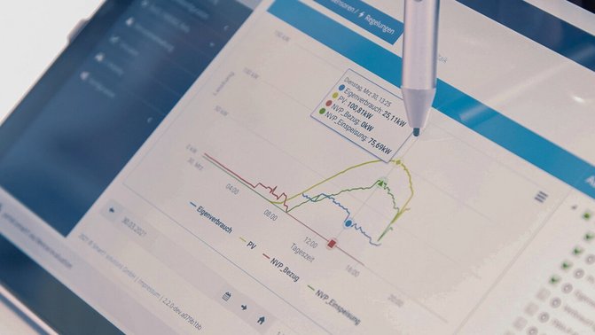 Aktywne zarządzanie obciążeniem optymalizuje indywidualny profil zużycia energii w Twojej firmie. Zużycie energii elektrycznej (np. na etapie produkcji) jest przenoszone z godzin o małym nasłonecznieniu na godziny o dużym współczynniku nasłonecznienia. Jest to możliwe dzięki inteligentnemu systemowi sterowania, który posiada między innymi dostęp do prognoz pogody.